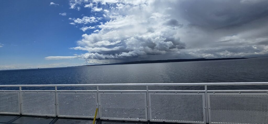 Als we een stukje onderweg zijn zie je pas goed wat een donkere wolken we achterlaten.