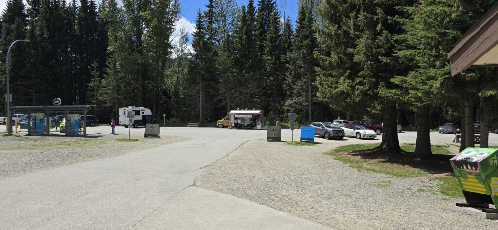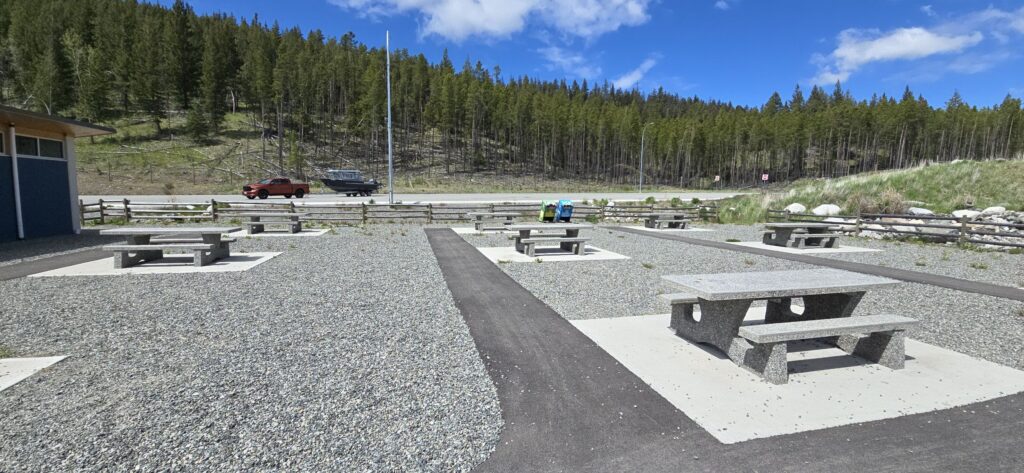 Onze eerste stop was op een grote parkeerplaats waar ze allemaal tafels hadden en niemand ze gebruikte.